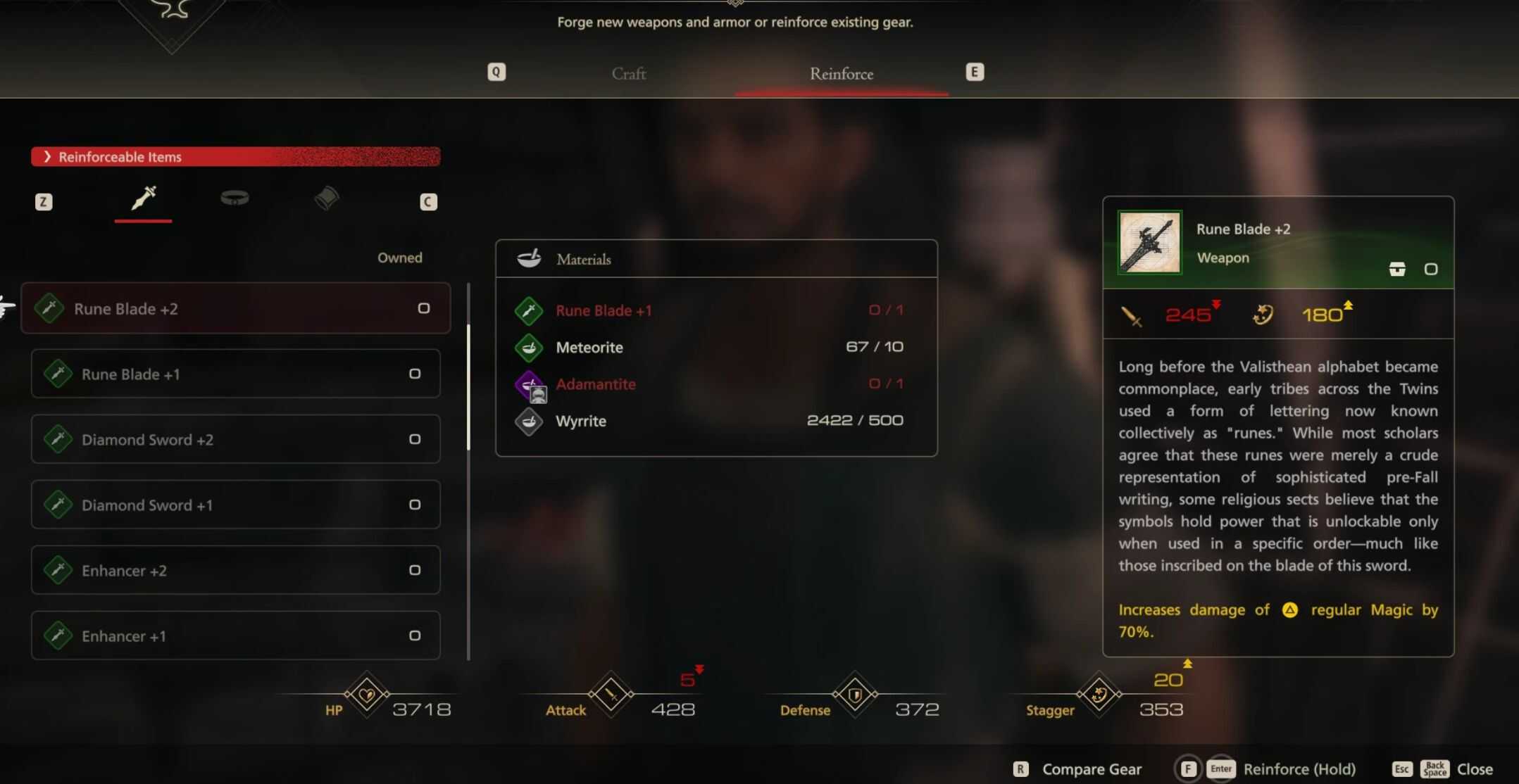 To that end, the following are key aspects of the Mod:Basic swords (in act 1) can be fully upgraded to +2 by the end of the first arc. These cap between 140 and 150 attack and provide significant bonuses to lunge, downthrust, and/or overall damage to give players a taste of this system. However, after the first arc, their usefulness will decrease.,All other swords start at 150 (starting with the Gaia Blade) and are usually not upgradeable till after Titan. Swords increase in power roughly by 15-20 attack each tier: getting a new sword is almost always a power increase. +1 are harder to get now however because there is a high wyrrite cost attached to the upgrades starting at +1 (500). However, as +1 versions for many of these swords hit 200, which is right where the sword purchasable at the time Wyritte becomes BUYABLE is (210), all swords should be balanced at this time. Weapon tiers will continue to upgrade to 230 (defender) which can be upgraded to +1 at 240. At this time, the final arc of the game begins. After the arrival at the fourth zone, all the following hunts will now drop ores of adamantine that can upgrade all post arc 1 swords to 250 attack. Charon will also sell new elementium ore that upgrades the elemental swords, but these will be EXPENSIVE.