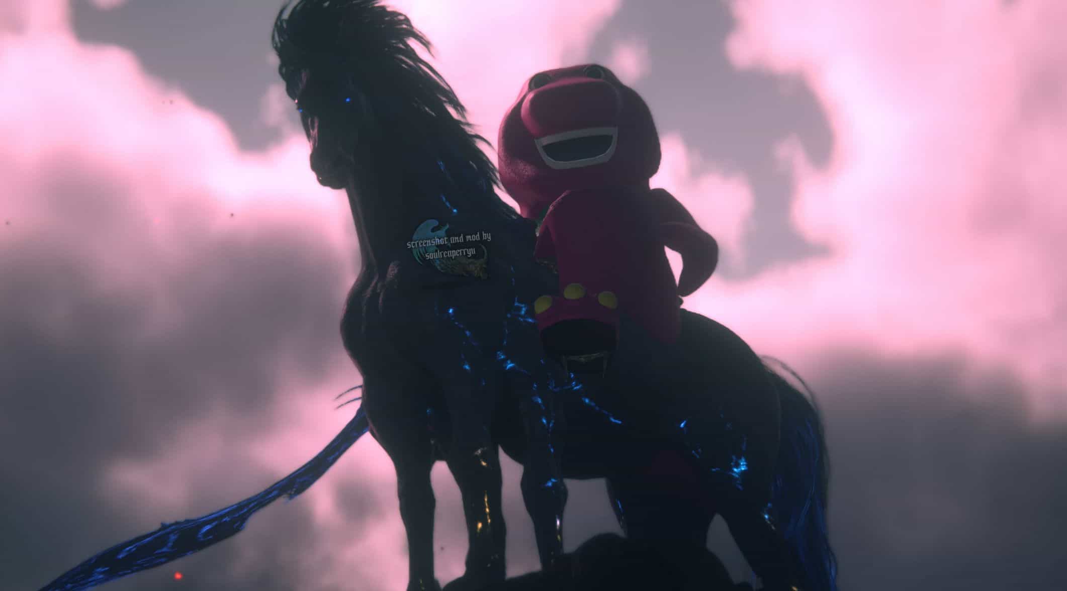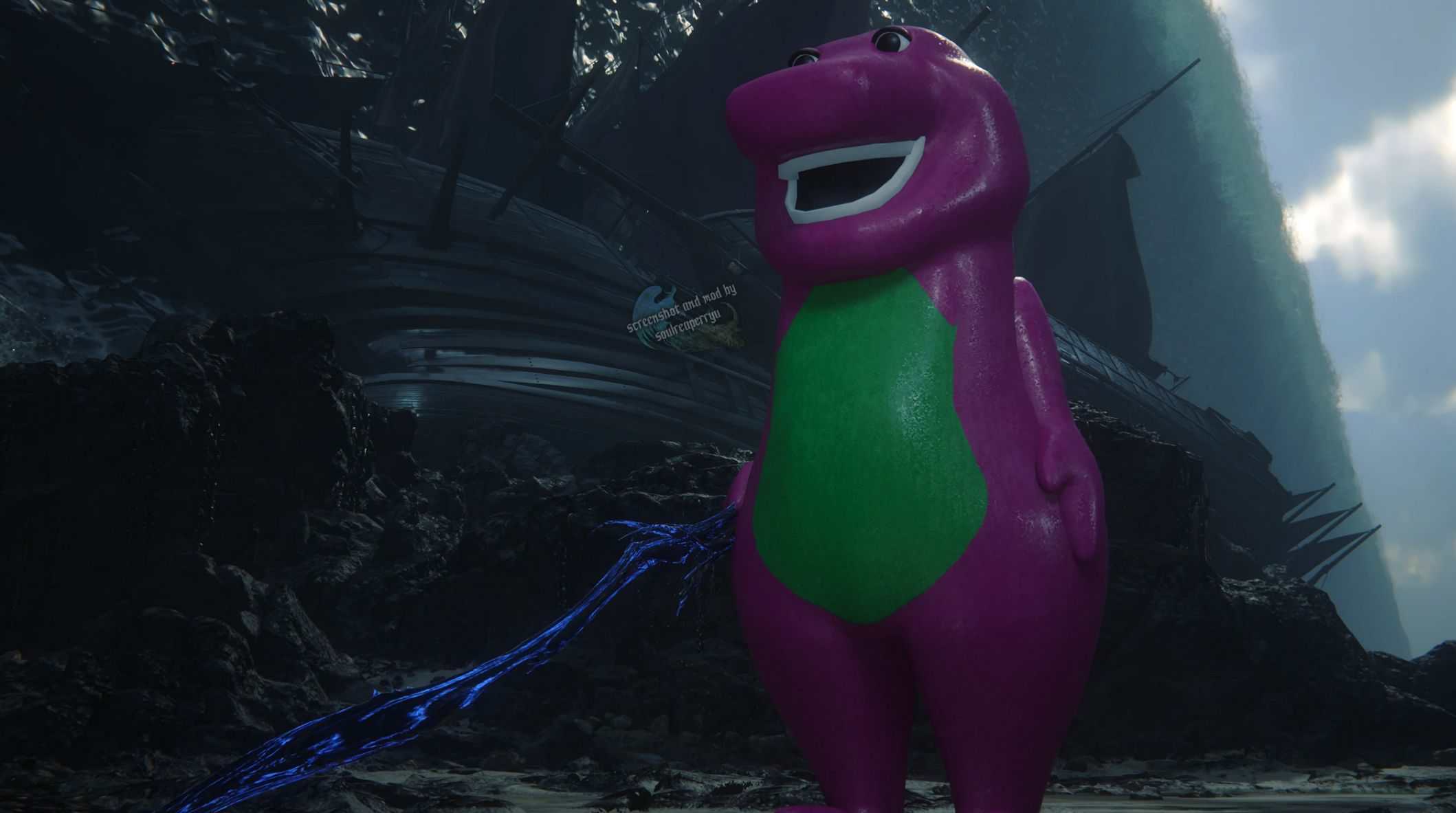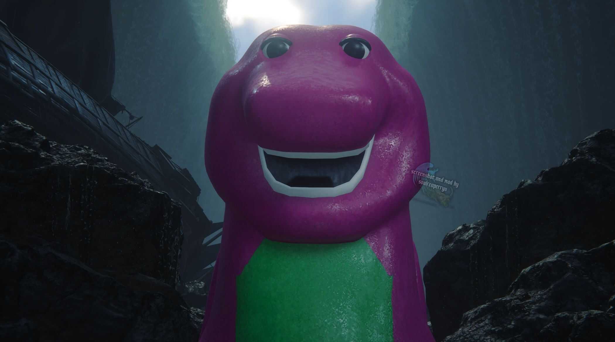 A shitpost mod replaces Barnabas with Barney the Dinosaur.